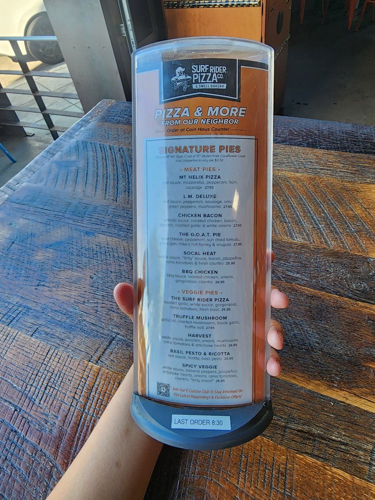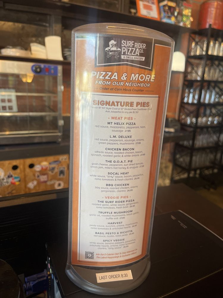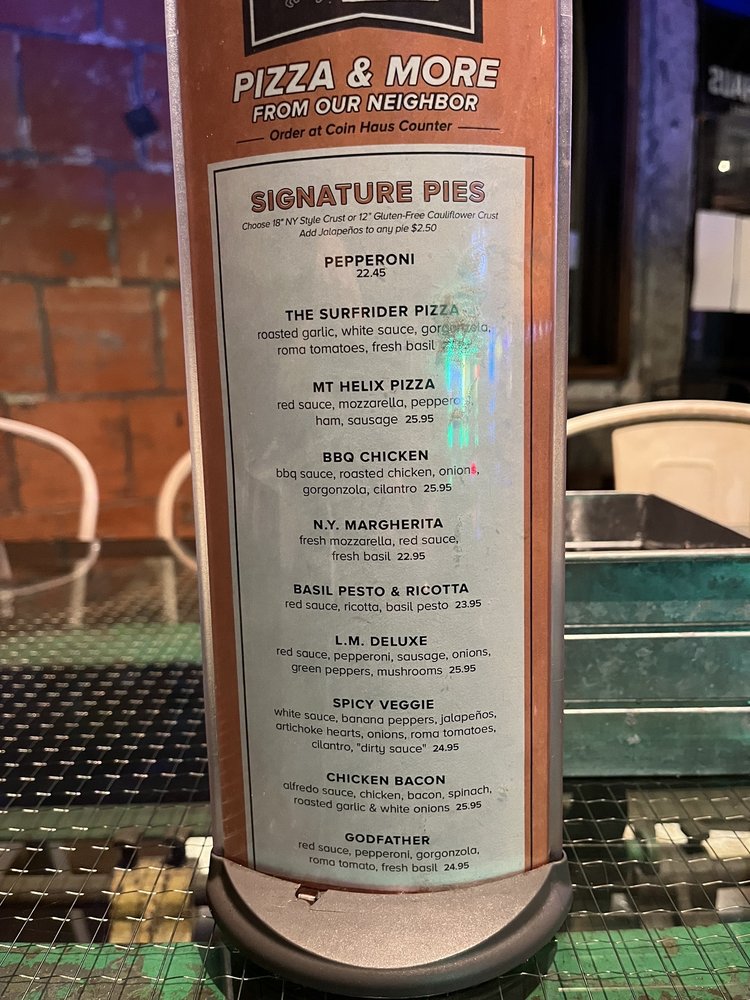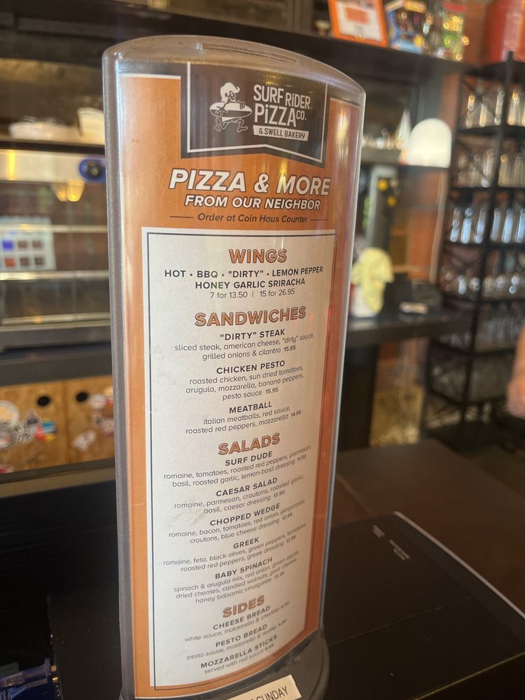 The food at Coin Haus is served by their partner, Surf Rider Pizza, and it does not disappoint. Each dish showcases a creative twist that keeps patrons coming back for more. Here are a few highlights: