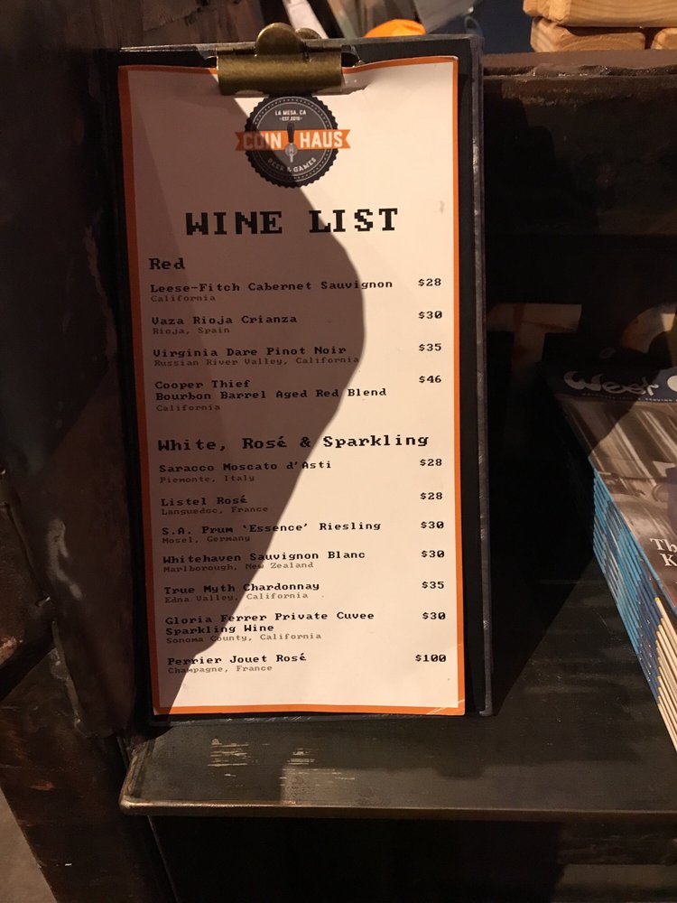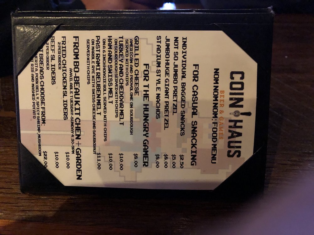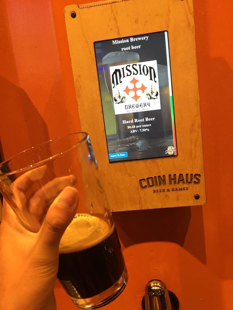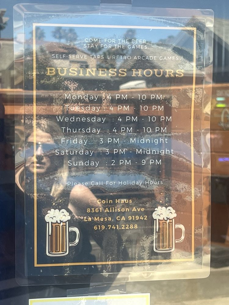 “ Stopped in around 5 on a Saturday to a relatively empty establishment. In any other city I'd be worried...but in San Diego area, I'm just relieved I don't have to wait for a table. We showed up, traded credit cards for Coin Haus cards and got to pouring. Keep your eyes on that per ounce price, there was a mistake on my pour that was quickly remedied. We ordered wings and pesto bread. I would say...maybe eat somewhere else. It wasn't terrible, but also not quite noteworthy food. I think the draw of the place is more the cool pour yourself a pint aspect. We loved the video games, and the cargo box of kegs. It felt like a funky place to bring out of town visitors. We may come back again, it would be perfect for after a day of walking around and shopping throughout downtown la Mesa. ”